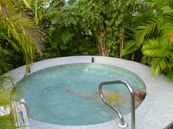 Nun traf ich mich also mit Ralf, den ich aus dem Flieger kannte. Er hatte eine Pauschalreise gebucht und so verabredeten wir uns in seinem Resort, dem Mariner´s Beach Club (anscheinend das älteste Resort am Seven Mile Beach). Als Gast von Ralf konnte ich alle Annehmlichkeiten nutzen, die die All-Inclusive-Touristen hatten. Dabei gefiel mir das Jacuzzi im Palmenwald am besten. Abends hatte man hier einen Sternenhimmel, der wirklich Hollywood-tauglich ist. Wir befreundeten uns auch schnell mit Barkeeper Omar und so verbrachte ich die nächsten 2 Tage am Strand bzw. im Jacuzzi.